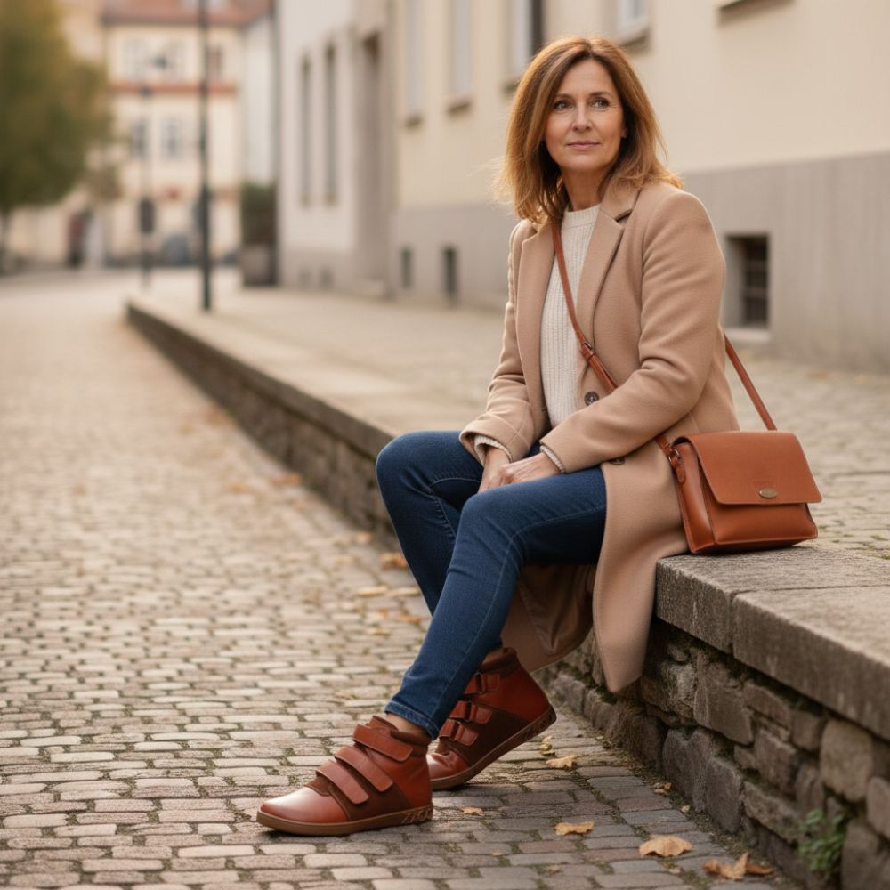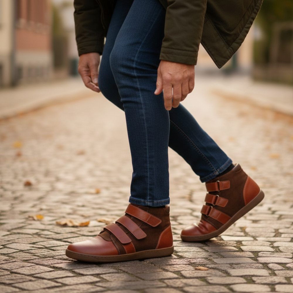 Qooper on puoli -korkea paljain jaloin kenkä, joka näyttää erityisen jalo ruskean nahkansa vuoksi ja on yksinkertaisesti uskomattoman mukava käytännöllisen tarranauhan kiinnittimen kanssa.